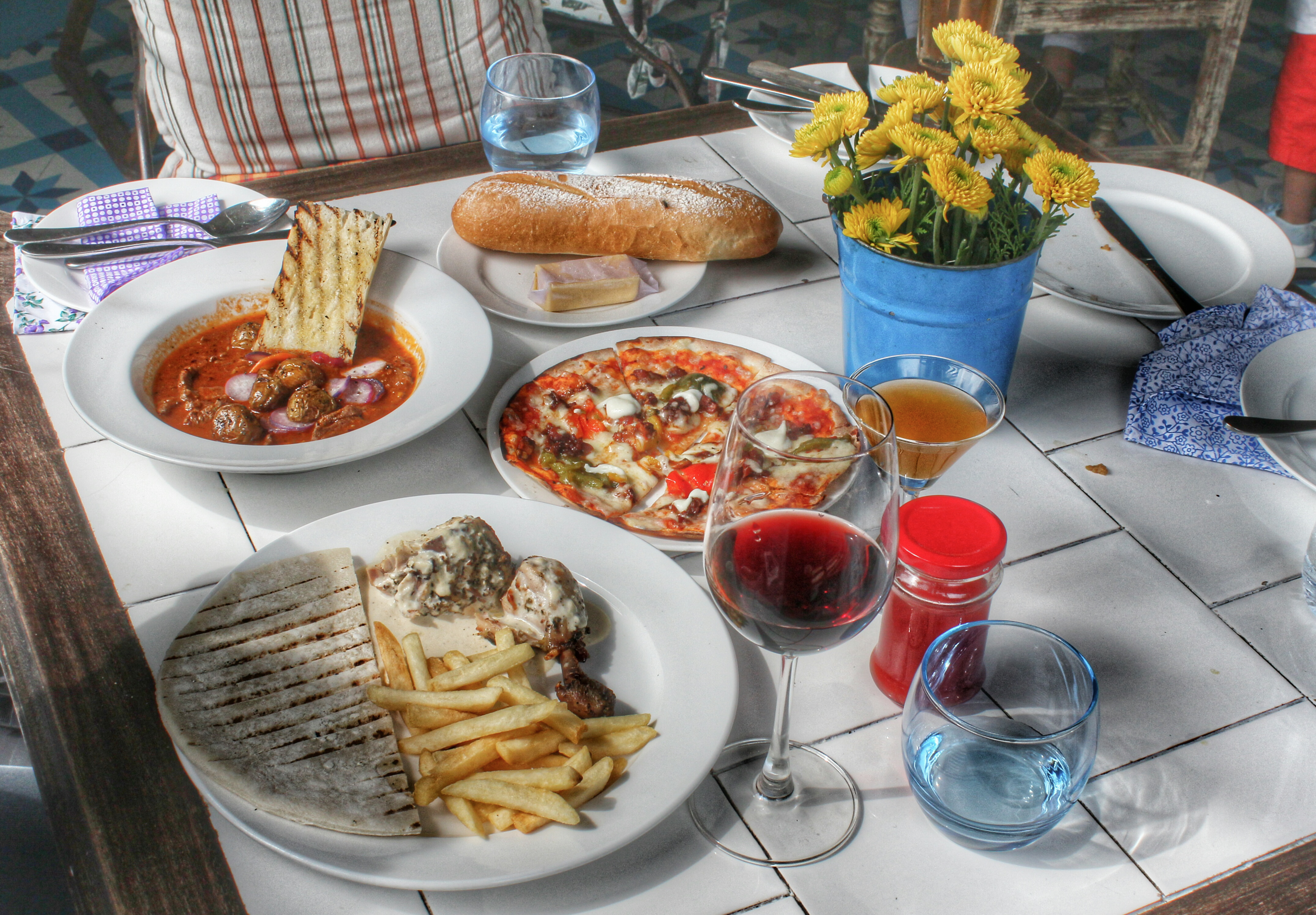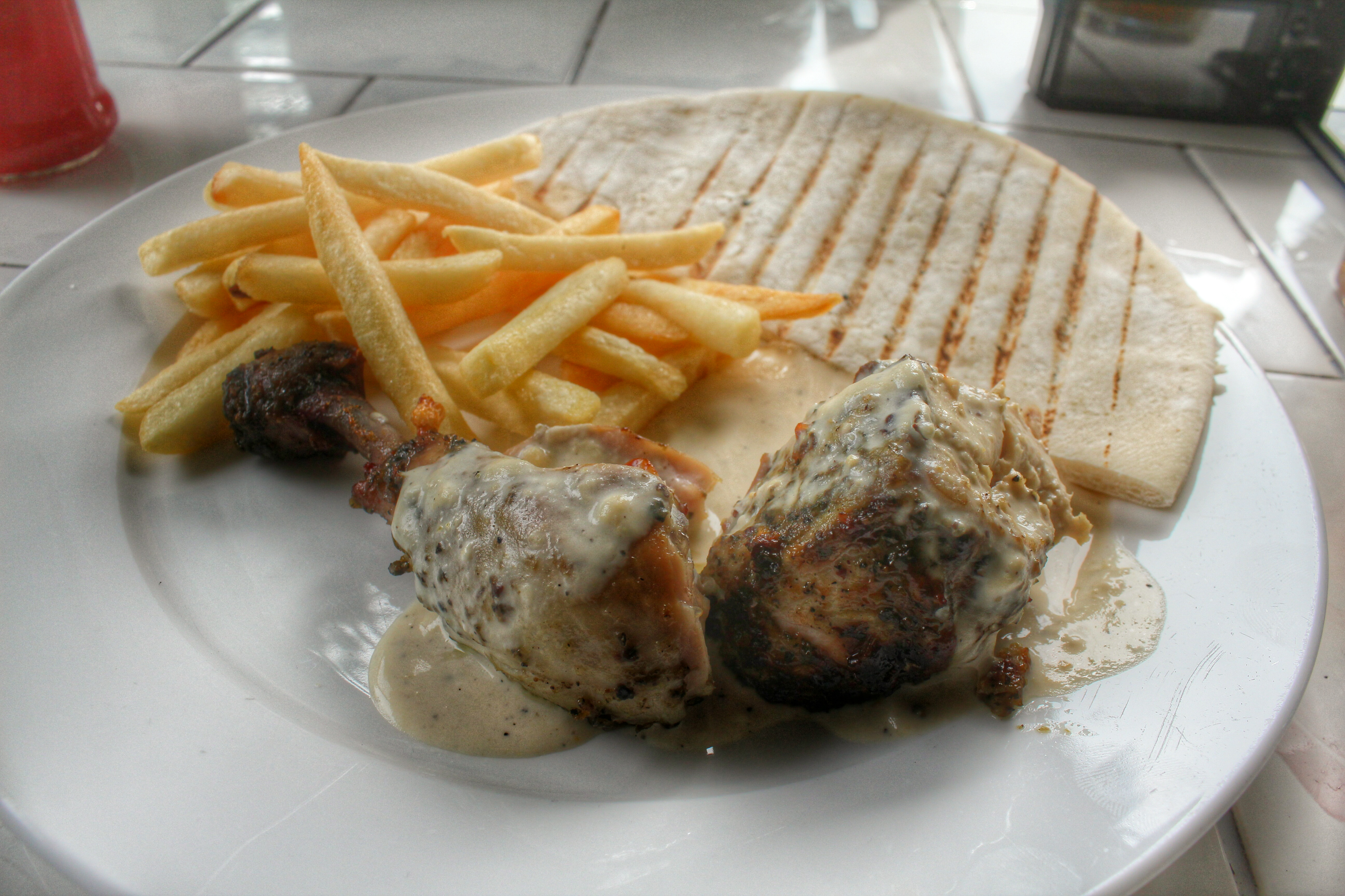 Roast Chicken – With so many flavours over-powering the palette, an Arabian touch was what we needed. In comes the cream sauce grilled chicken with grilled pita and hummus. Light and fresh with chips to go with. Although I wanted something mild, this seemed milder than anything we had that day.